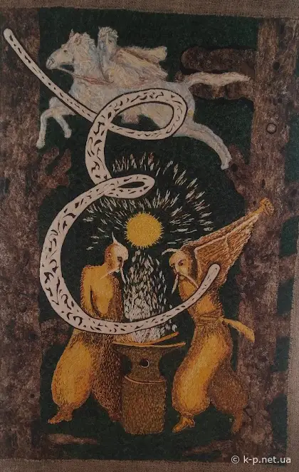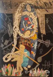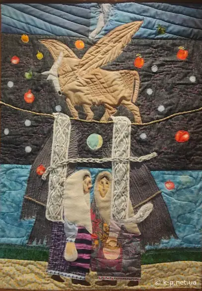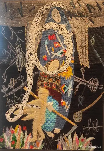 В сусідньому залі експонується сам цикл Негоди - можна піти порівняти оригінал і творчу інтерпретацію у текстилі. Якщо у "Мамаї" були суворі вимоги до матеріалу, то у "Абетці" більше свободи і фантазії: тут є поєднання клаптикового шиття з валянням та ткацькими техніками. На літері С на задньому плані - ніби рядно, домотканна груба така тканина. Але це не рядно, це художній стібок. Вражає. Музейне освітлення дуже вигідно підкреслює опуклість, рельєфність квітлів.